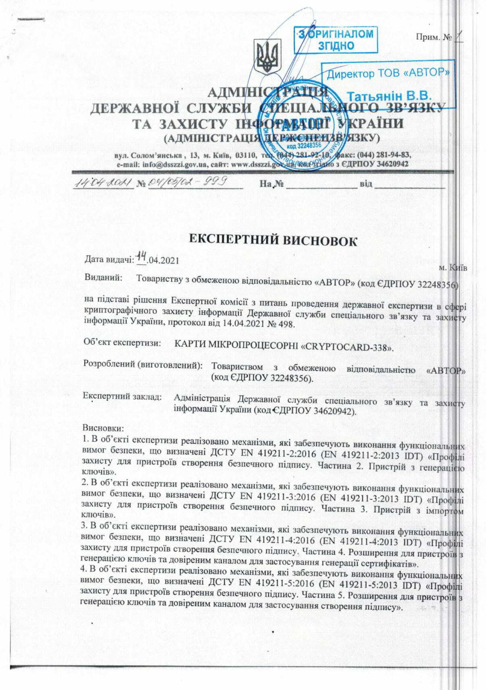 Повна назва: Засіб КЗІ смарт-карта «CryptoCard-338L» (експертний висновок ДССЗЗІ України № 04/03/02-134 від 20.01.2020р., експертний висновок ДССЗЗІ України №04/05/02-999 від 14.04.2021р.) з ліцензією на програмний продукт «Засоби кваліфікованого електронного підпису «CryptoLibV3» (експертний висновок ДССЗЗІ України №04/03/02-3956 від 21.12.2019р.)