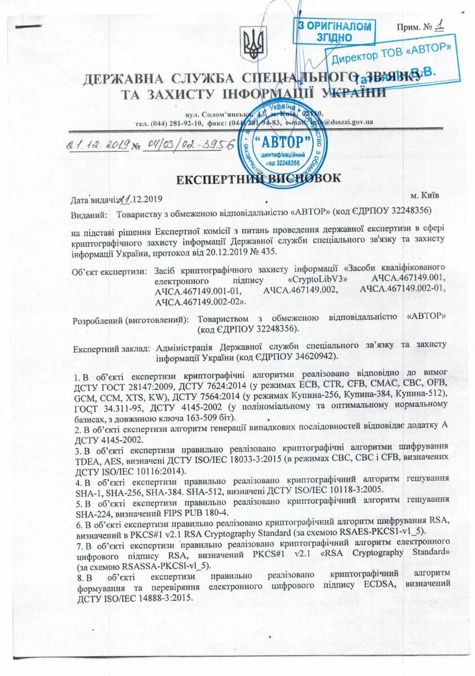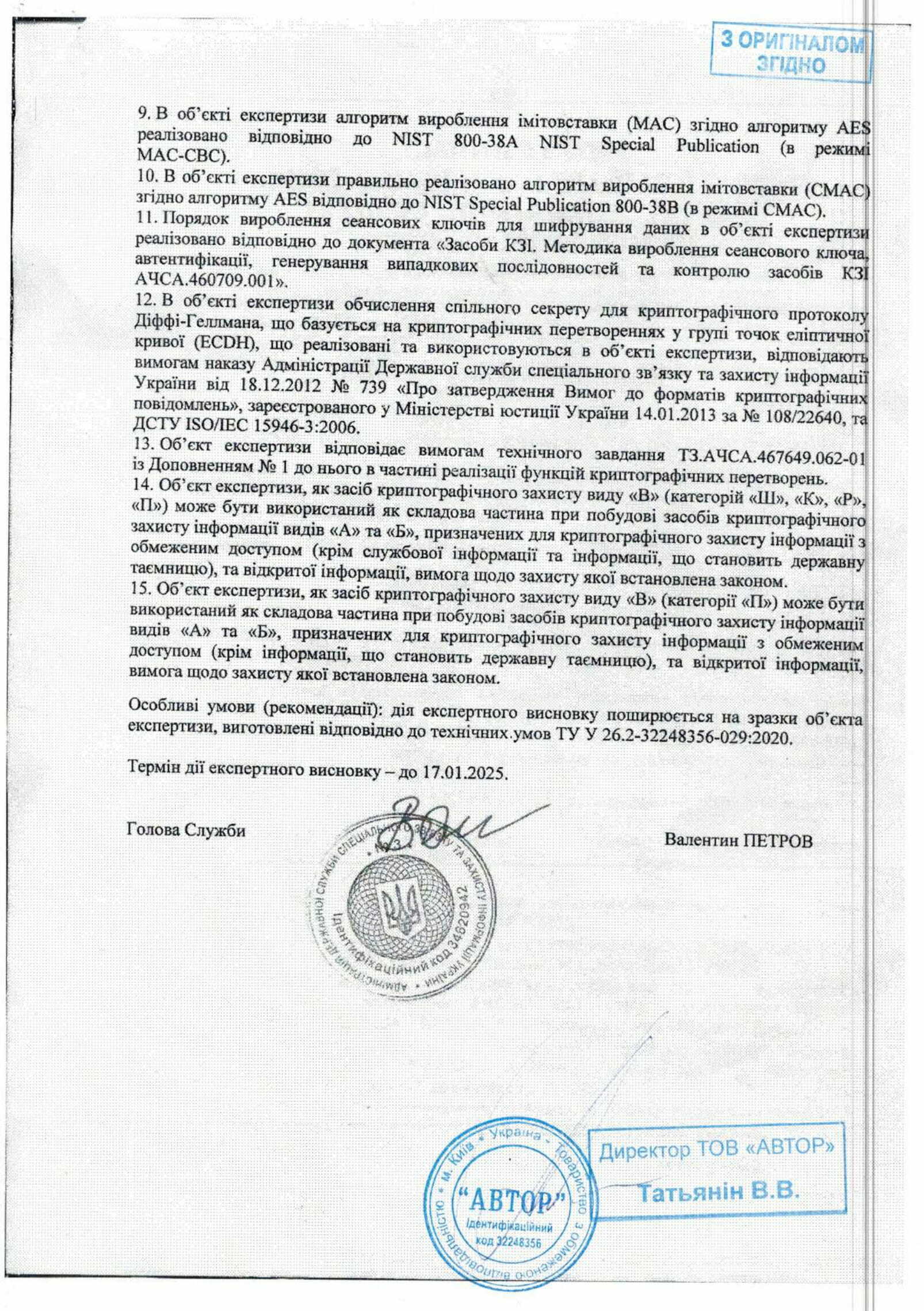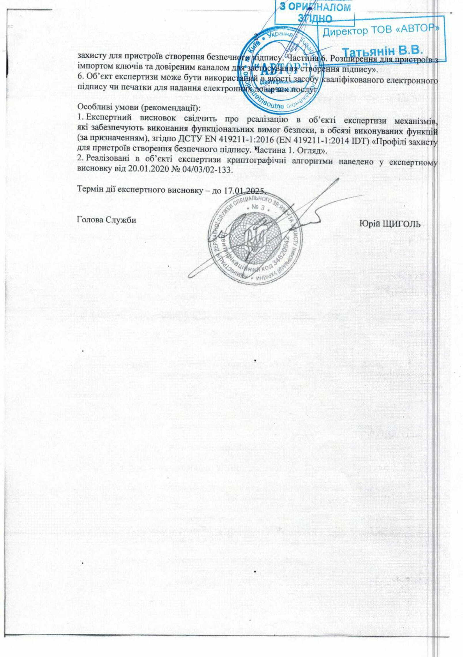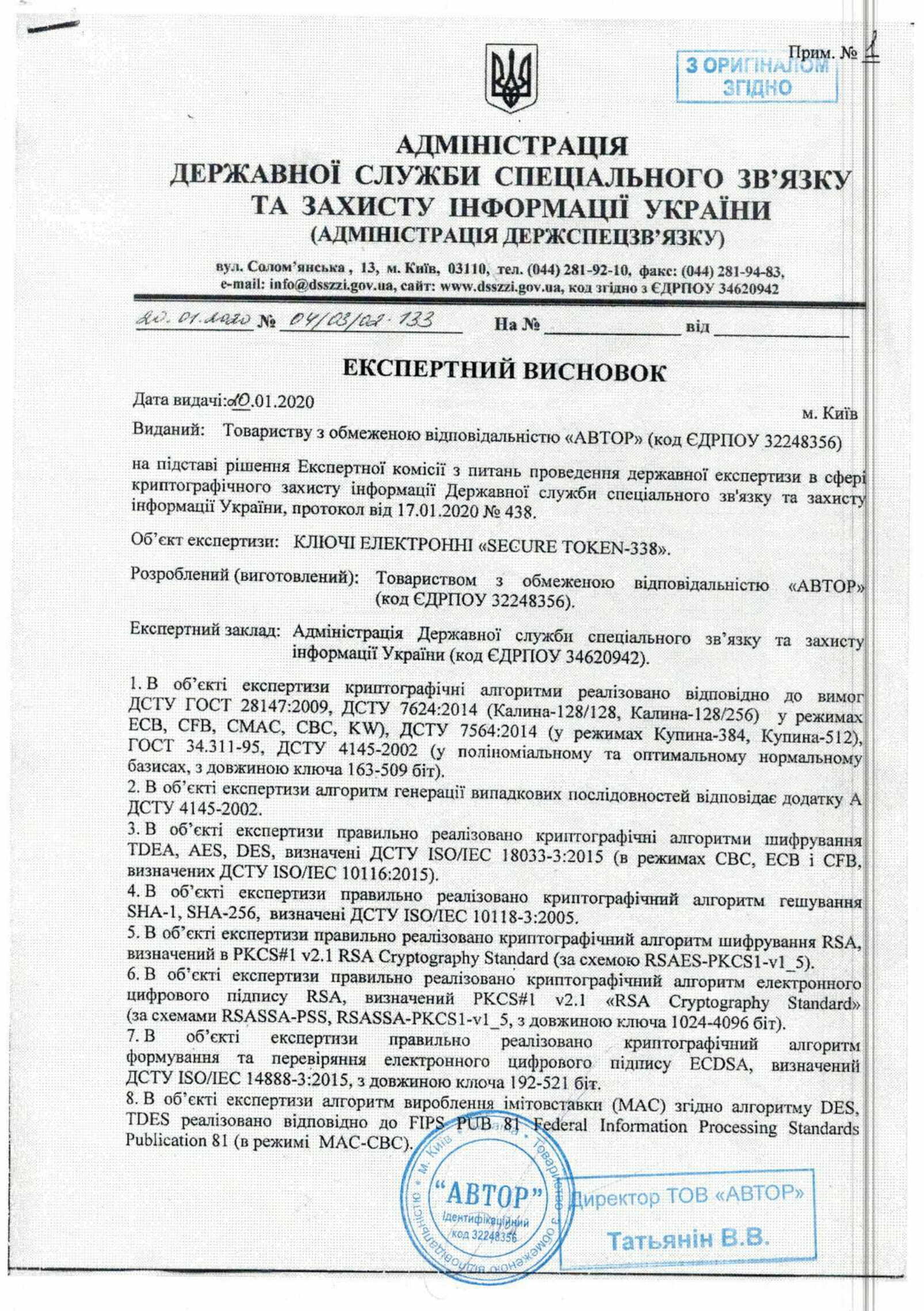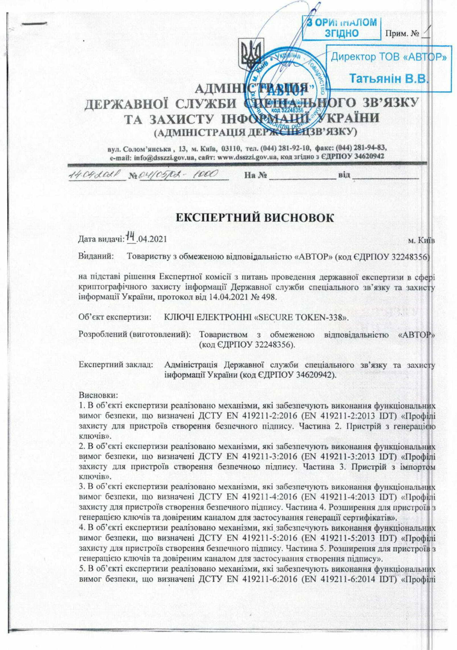 Повна назва: Засіб КЗІ електронний ключ «Secure Token-338 S» (експертний висновок ДССЗЗІ України № 04/03/02-133 від 20.01.2020р., експертний висновок ДССЗЗІ України №04/05/02-1000 від 14.04.2021р.) з ліцензією на програмний продукт «Засоби кваліфікованого електронного підпису «CryptoLibV3» (експертний висновок ДССЗЗІ України № 04/03/02-3956 від 21.12.2019р.)
